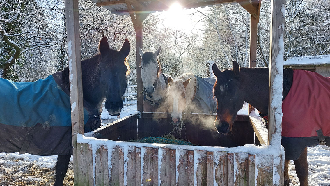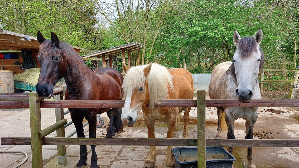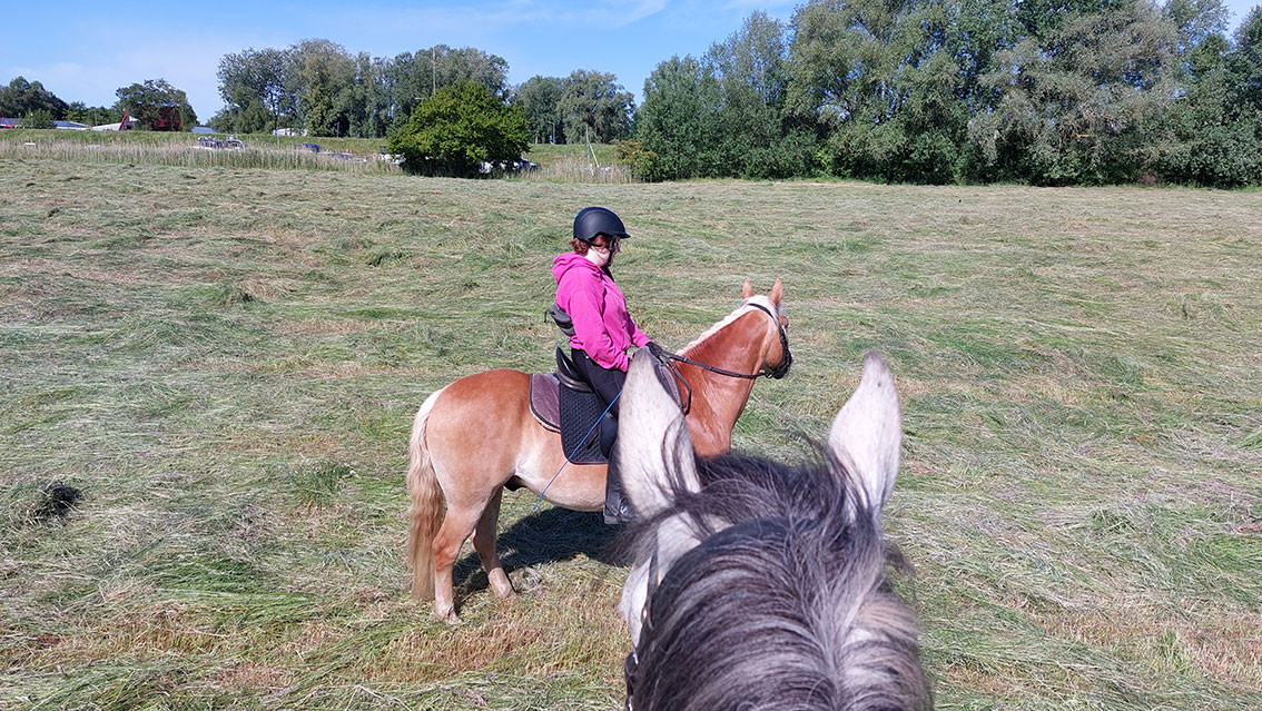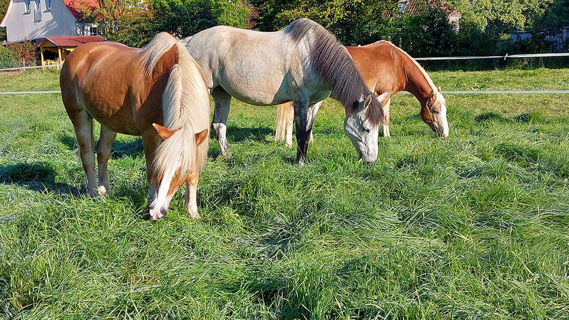 Unsere Pferde stehen auf den großen Sandflächen am Hof in gemischter Herdenhaltung mit Offenställen. Wir haben drei Stuten in der Gruppe und hoffen bald auf Nachwuchs. Auf den hofnahen Wiesenflächen dürfen sich unsere Pferde von Mai bis November austoben. Der tägliche Auslauf in der Herde, die Spaziergänge und regelmäßige Bewegung, auch im Straßenverkehr macht sie nervenstark und zuverlässig.